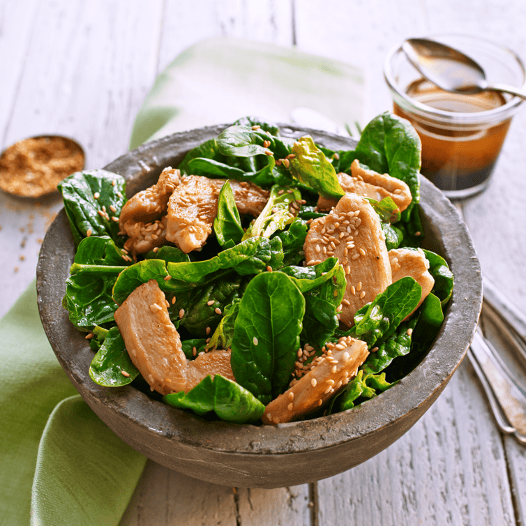 Nel frattempo, lava ed asciuga con molta cura gli spinaci novelli e prepara la salsina per condire l’insalata, emulsionando l’aceto balsamico, l’olio rimanente, una presa di sale (poco) e una macinata di pepe fresco.