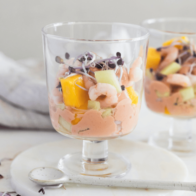 Cocktail di gamberetti con mango, cetriolo e aneto