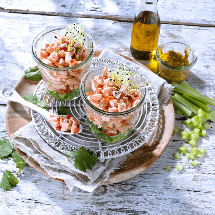 Raccogli in una ciotola tutte le verdure e aggiungi i cubetti di salmone: condisci con la salsa, mescola con molta delicatezza e passa l’insalata, coperta, in frigorifero per almeno 1 ora prima di servirla.