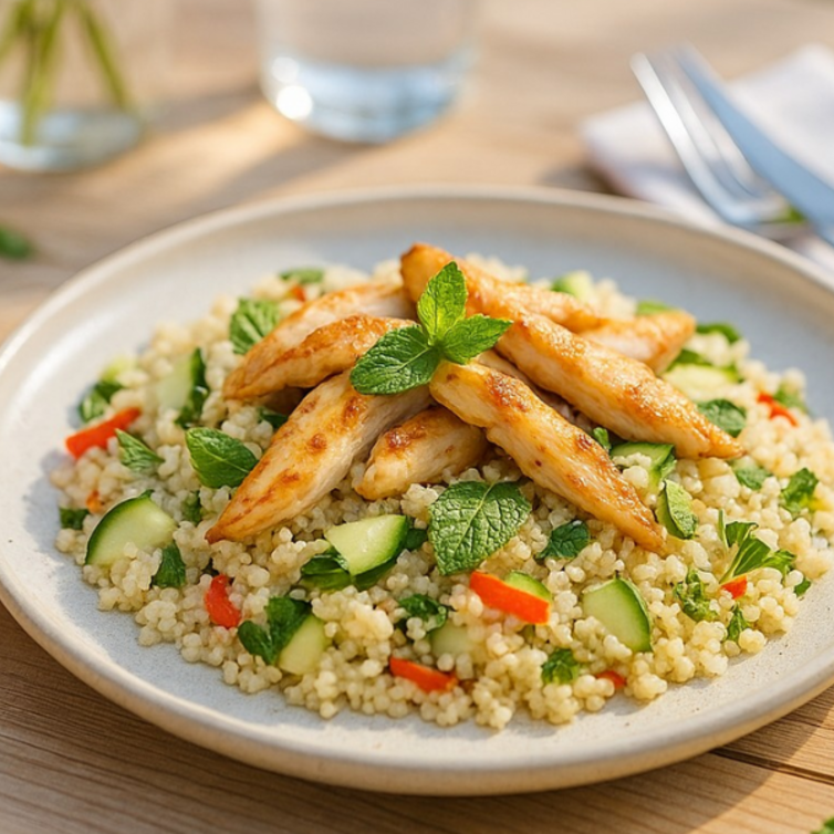 Couscous con cuori di filetto di pollo, menta e verdure crude