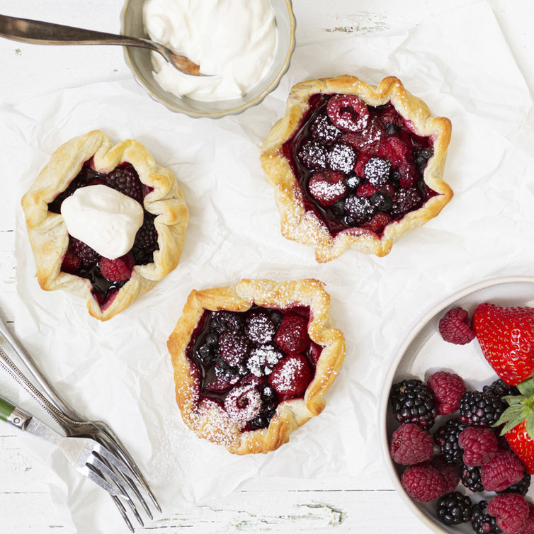 Solleva delicatamente i bordi della pasta sfoglia intorno alla frutta e disponi le tortine su una teglia foderata con carta da forno. Cuoci nella parte centrale del forno per circa 20 minuti, finché risultano dorate.