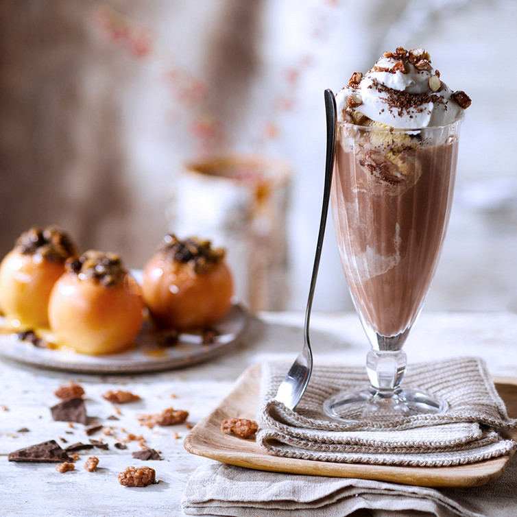 Metti una pallina di Nocciola Extra ed una pallina di Kopenhagen in un bicchiere molto alto. Versa il latte mescolato al cacao fino a coprire il gelato. Decora con la panna montata, le cialde e la cioccolata.