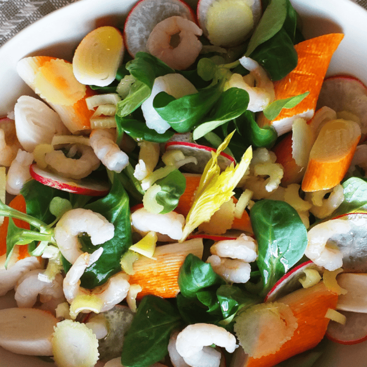 In un ciotola capiente raccogli la valerianella lavata e asciugata, i ravanelli e il sedano affettati finemente, i gamberetti, la Polpa Gran Lusso tagliata a rondelle.