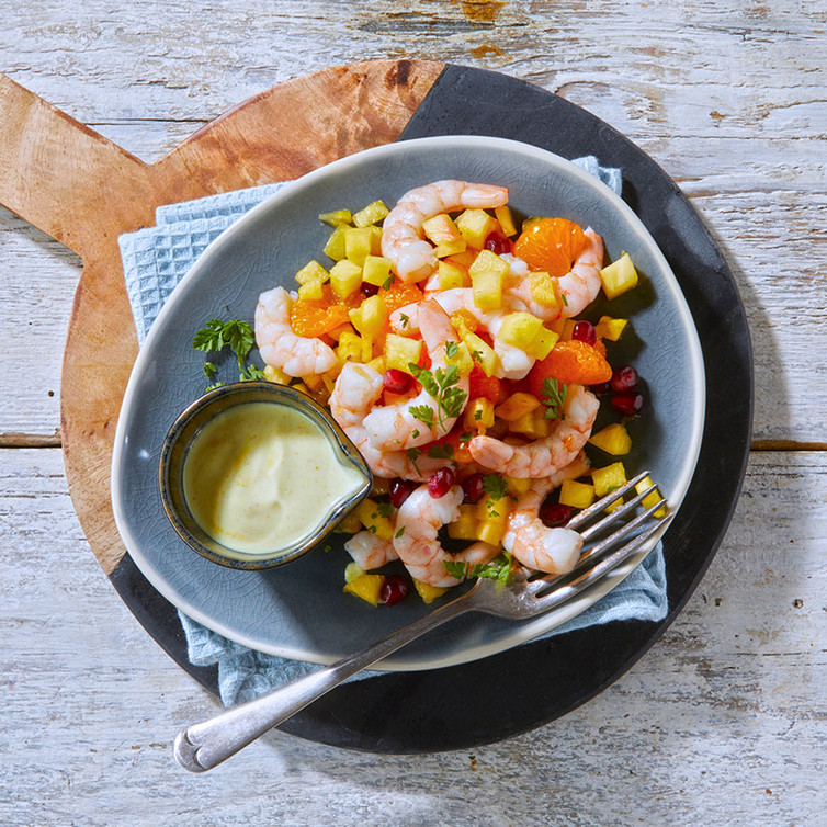 Ontdooi de garnalen volgens de instructies op de verpakking. Verwijder het staartsegment, spoel ze af met koud water en laat daarna goed uitlekken. Schil mandarijnen en snijd in partjes. Schil de ananas en snijd in kleine stukjes.