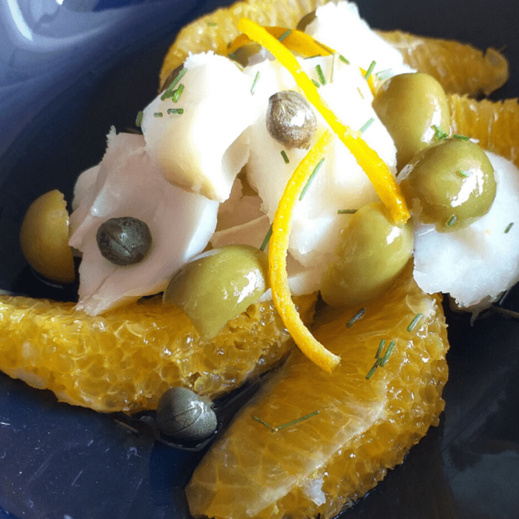 Sistema il merluzzo al centro del piatto e completa con i capperi, l’erba cipollina, le Olive schiacciate, le fette e la scorza delle arance, qualche goccia di Aceto Balsamico di Modena IGP.