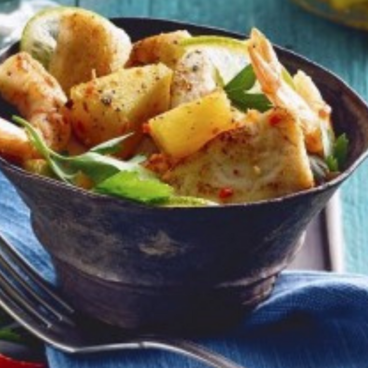Raccogli in una ciotola (meglio se in vetro) il pesce e i gamberi con il fondo di cottura, i cubetti d’ananas, fettine sottilissime di lime, la salsa preparata e qualche foglia di coriandolo spezzettata (oppure il prezzemolo): mescola con cura e servi questa insalata tiepida o fredda.