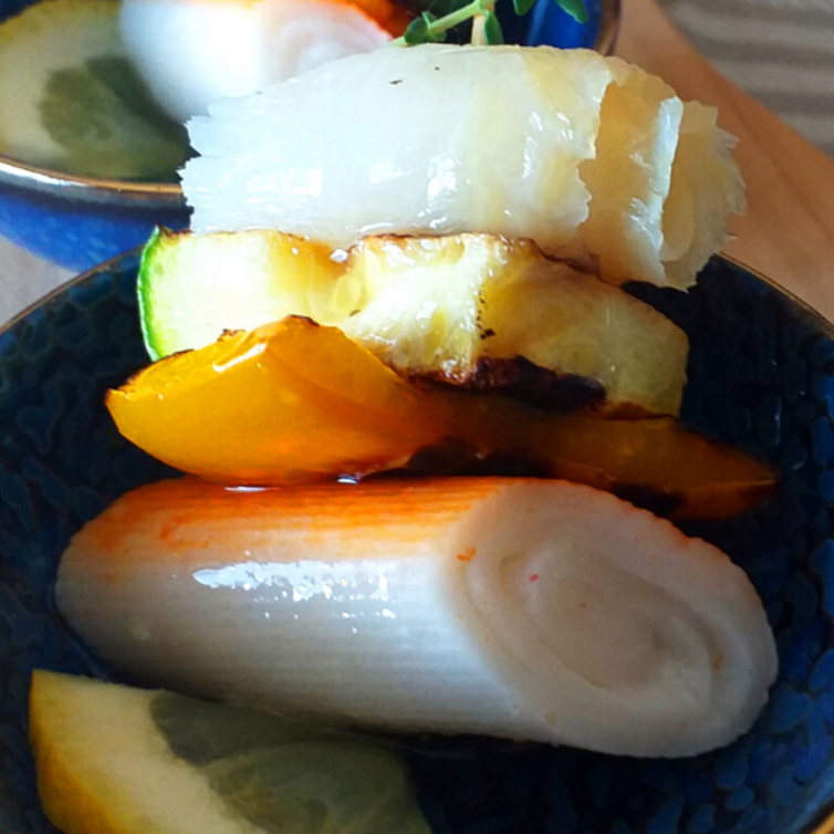 Assembla ora gli spiedini: su uno stuzzicadenti infilza un pezzo di polpa gran lusso, uno di peperone, uno di zucchina e la rosellina di halibut. Sulla punta completa con un quarto di fettina di limone.
