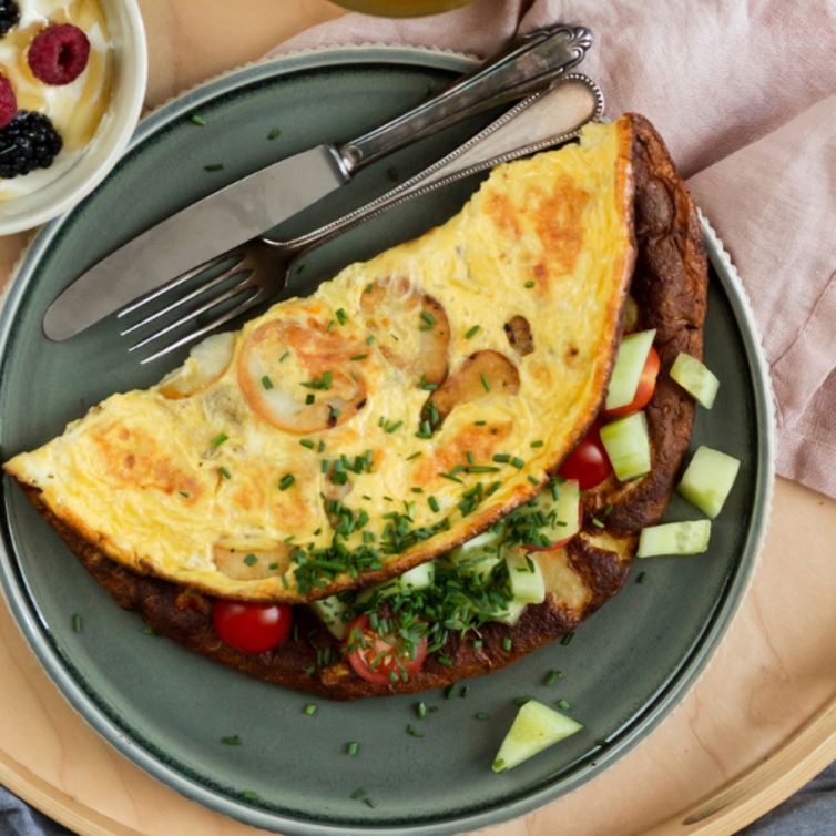 Fai scivolare la frittata su un piatto grande. Guarnisci con le fette di pomodoro, i dadini di cetriolo e l’erba cipollina. Piega la frittata a metà e servi accompagnandola con del pane.