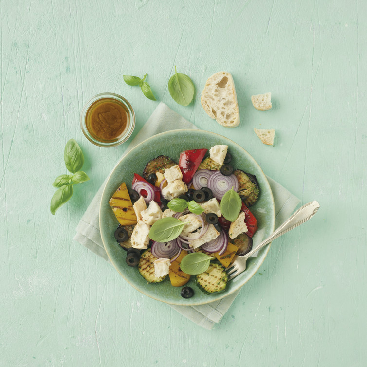 Sbuccia la cipolla e tagliala a rondelle sottili. In una ciotola capiente, unisci le verdure grigliate raffreddate, gli anelli di cipolla e alcune foglie di basilico fresco. Aggiungi le olive tagliate a striscioline (o intere, se preferisci). Completa con i crostini di pane preparati in precedenza.