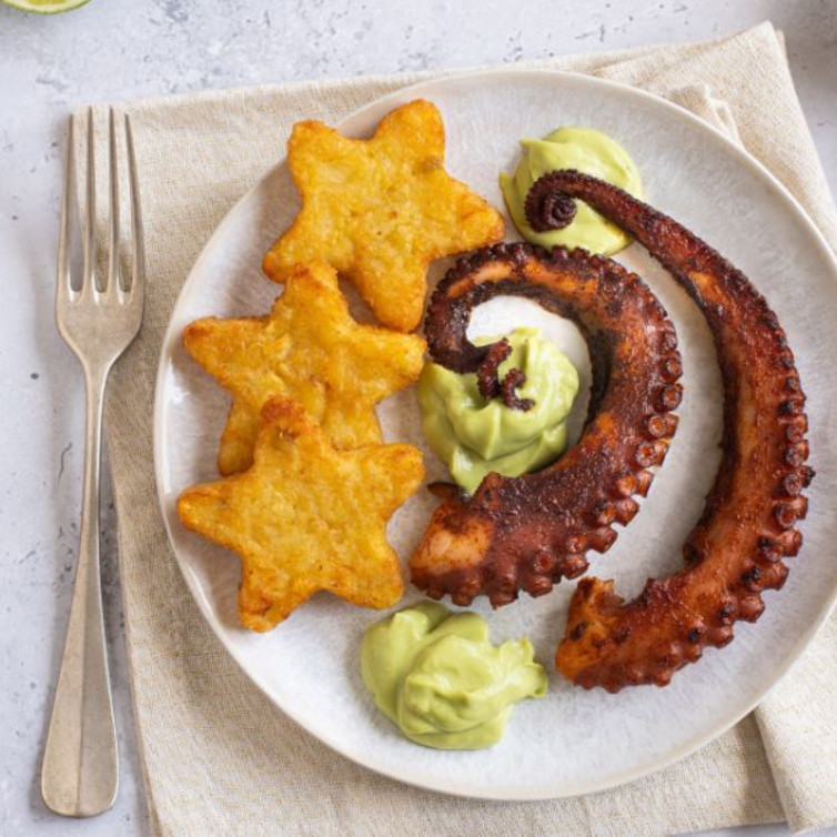 Polpo alla paprika con stelline di rösti e maionese di avocado