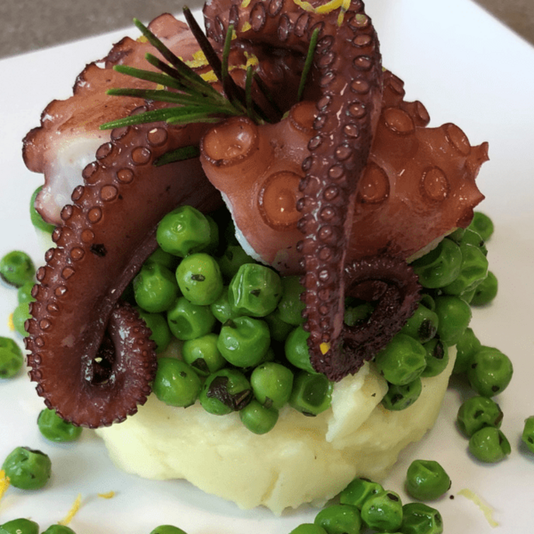 Polpo arrosto con purè e piselli