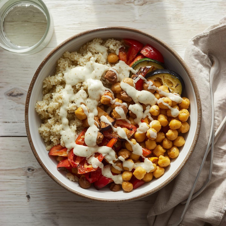 Assembla la bowl: Distribuisci la quinoa sul fondo, aggiungi verdure e ceci caldi, completa con la salsa e una spolverata di semi ed erbe fresche.