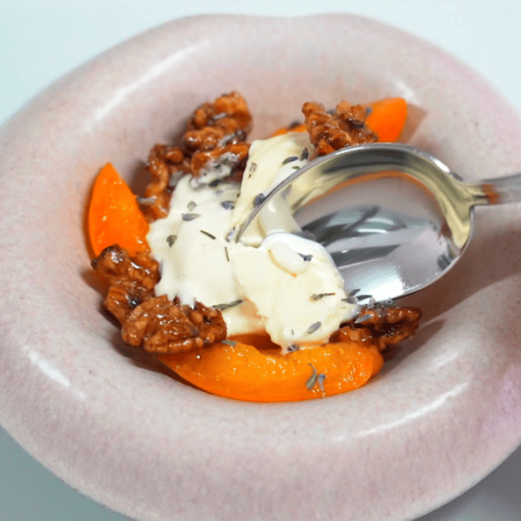 Impiatta le albicocche, cospargi con le noci, aggiungi il gelato e un po' di fiori.