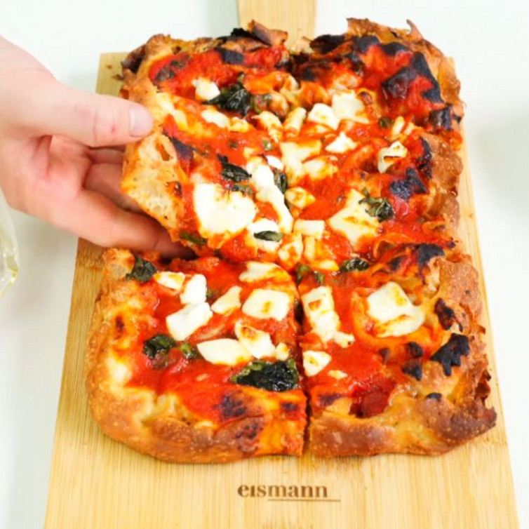 Trasferisci la pinsa nel tagliere di legno e tagliala a pezzi.