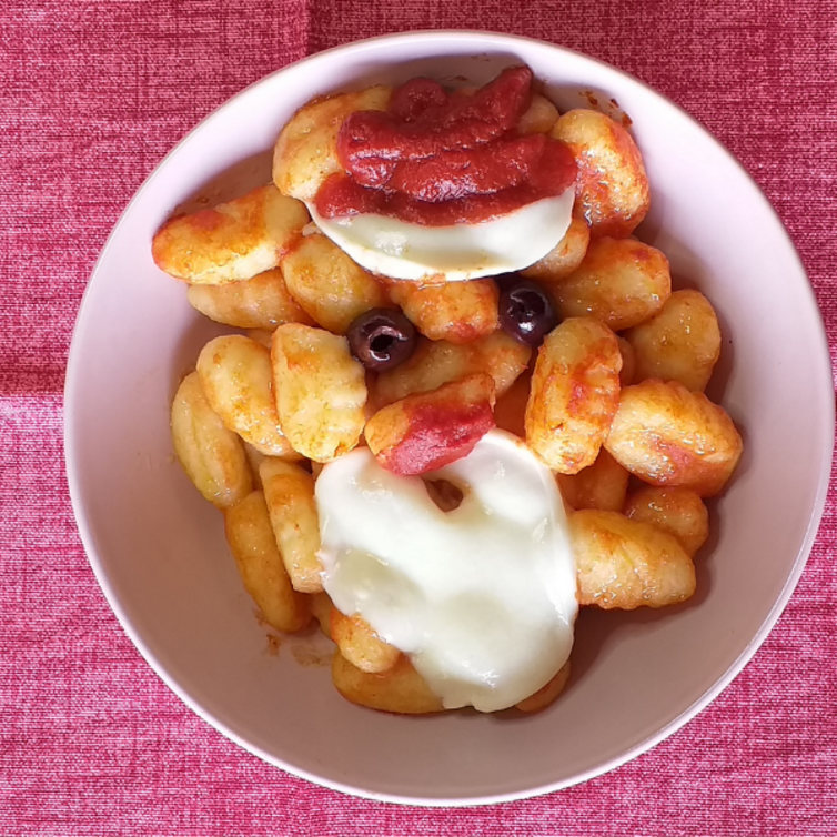 Suddividi gli gnocchi in 4 ciotole adatte anche al forno e procedi alla decorazione: ricava la barba da 4 fettine di mozzarella, mentre coi ritagli prepara la base del cappello; con la salsa rimasta disegna il cappello; infine, sistema 2 olive in modo che sembrino gli occhi. Passa in forno caldo a 180°C per 3-5 min.