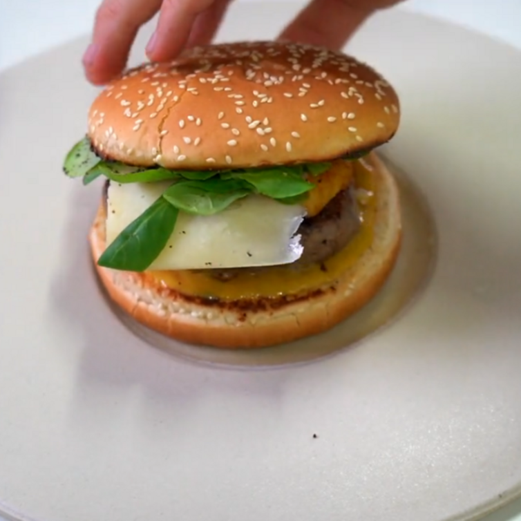 Poi metti l'hamburger, la patata "Röstinchen" e il formaggio.