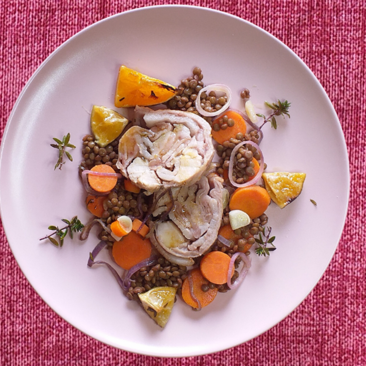 Ricetta Rotolo di coniglio agli agrumi con lenticchie e carote