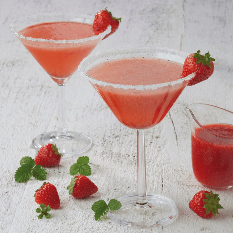 Versa la purea di fragole nei bicchieri, aggiungi il Prosecco Tintoretto Rosé DOC Extra Dry freddo e amalgama delicatamente il tutto. Guarnisci con una fragola e servi il tuo cocktail