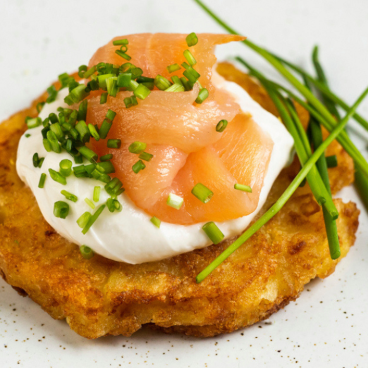 Posiziona le Patate “Röstinchen” su un vassoio e aggiungi su ciascuna un cucchiaio di crema al formaggio e una fettina di salmone affumicato. Decorale infine con l’erba cipollina.