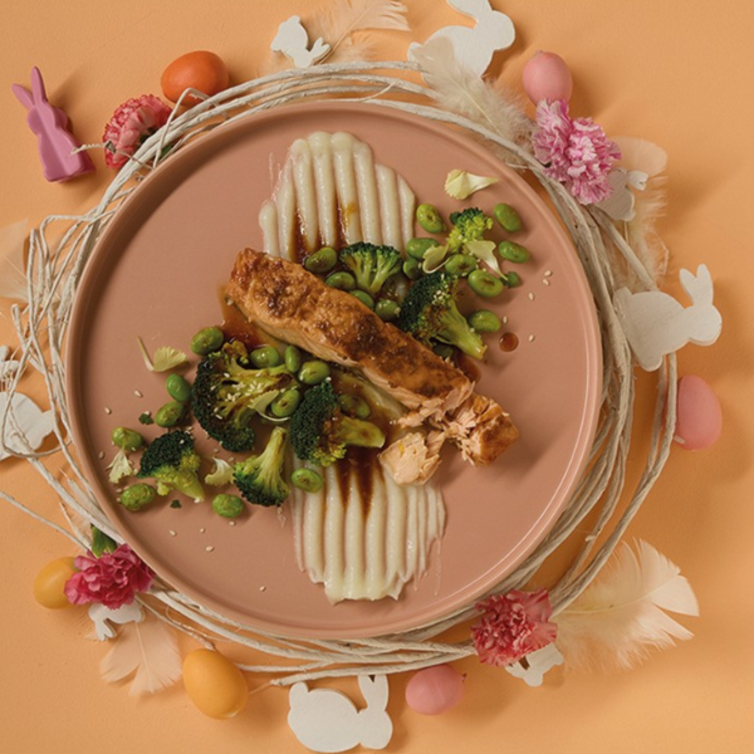 Un secondo piatto elegante e bilanciato, perfetto per chi ama i sapori delicati con un tocco orientale. Il salmone in salsa teriyaki si abbina a una cremosa base di cavolfiore e patate, arricchito da verdure verdi arrostite per un contrasto di consistenze e colori.