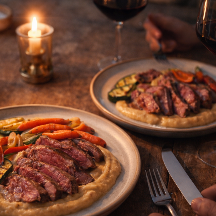 🍽️ Impiattamento elegante Stendi la vellutata calda sul fondo del piatto. Adagia la tagliata affettata sopra. Completa con zucchine e peperoni grigliati e qualche carotina mignon. Un filo d’olio a crudo e una macinata di pepe. Semplice. Raffinato. Inclusivo.