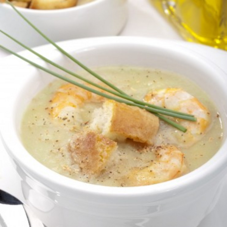 Distribuisci la vellutata nei piatti, spolverala con il Prezzemolo eismann e sistema al centro una cucchiaiata di gamberi e una porzione di crostini di focaccia.