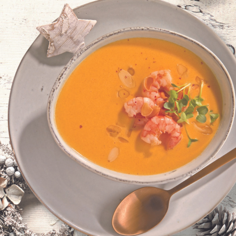 Tosta le scaglie di mandorle in una padella senza aggiungere grassi fino a che non raggiungeranno la doratura desiderata e mettile da parte. Versa la zuppa nei piatti fondi e guarniscila con le code di gambero e le mandorle a scaglie. Se vuoi aggiungi una manciata di crescione