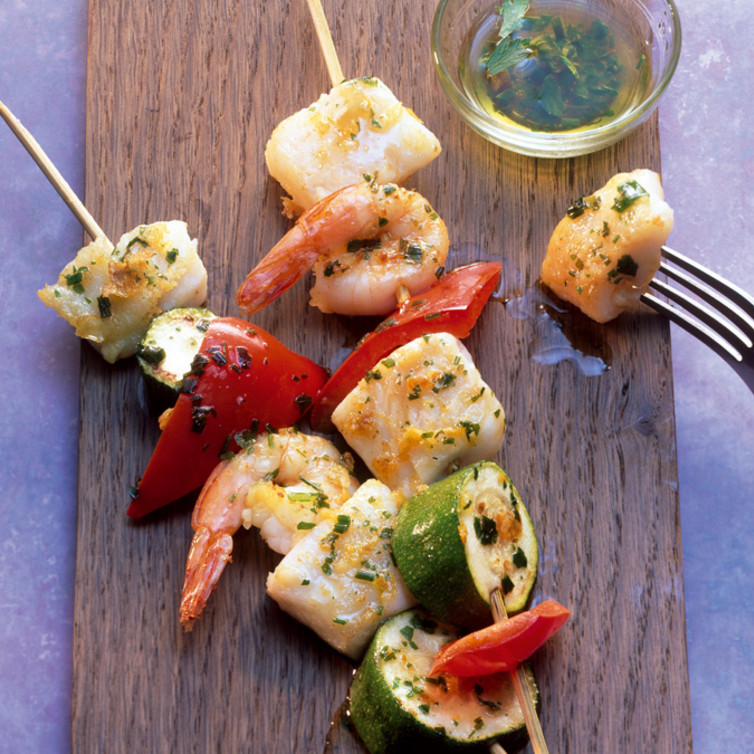 Rijg de pangasius, de garnalen en de groenten om en om aan een spiesje.