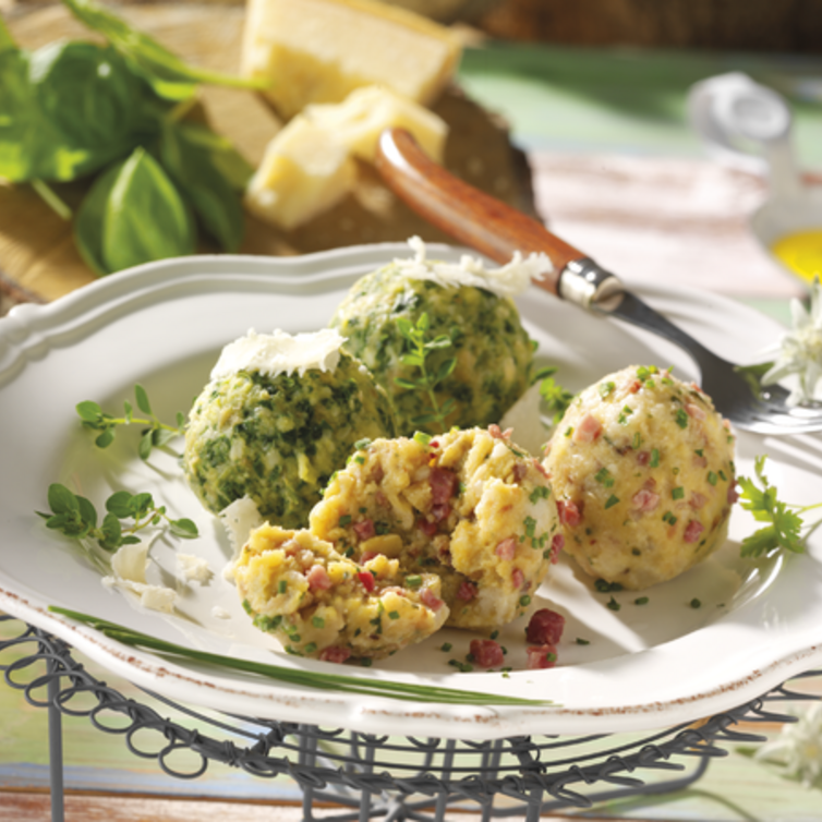Nel frattempo, porta ad ebollizione una pentola di abbondante acqua leggermente salata (se preferisci che il sapore dei due diversi tipi di canederli resti perfettamente distinto dopo la cottura, ti consigliamo di utilizzare due pentole distinte di acqua bollente): immergici i canederli, ancora surgelati, e cuocili con un coperchio per circa 18 minuti.