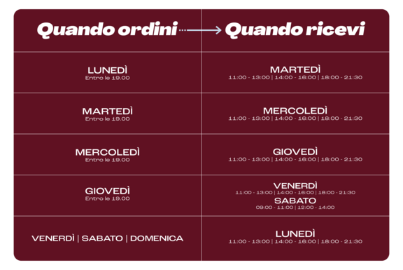 Una volta concluso l'ordine, verrai contattato/a per scegliere il giorno e l'ora che preferisci per la consegna.